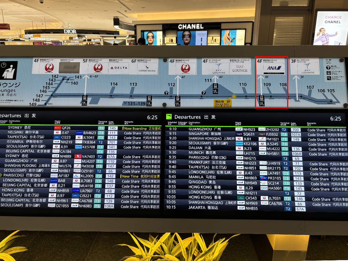 少し進むと案内板が見えてきます。案内に従ってエレベーターで4階に上がると、正面にANAスイートラウンジ、左手にANAラウンジがあります。
