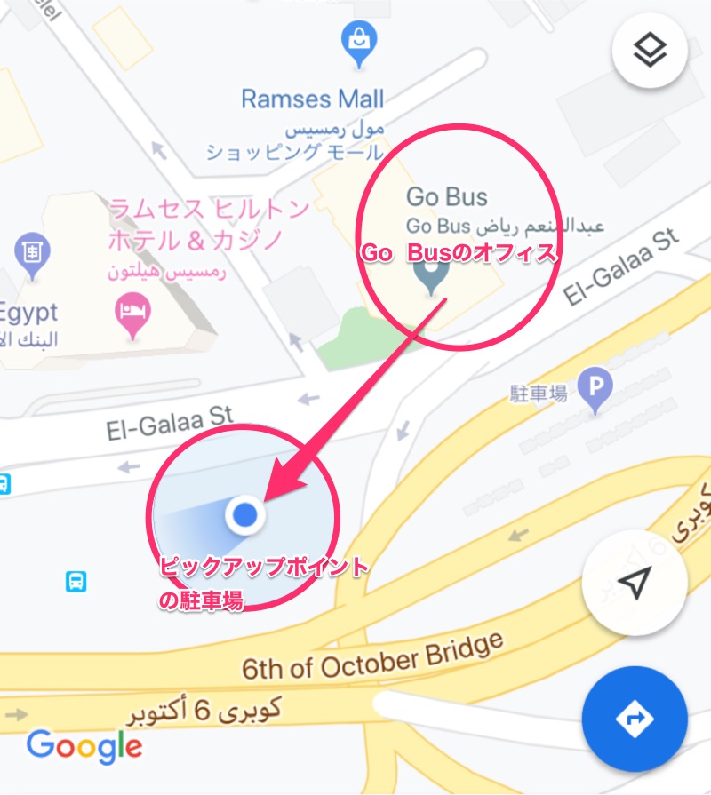 Go Busのピックアップポイントはラムセスヒルトンホテルの目の前にある駐車場です。