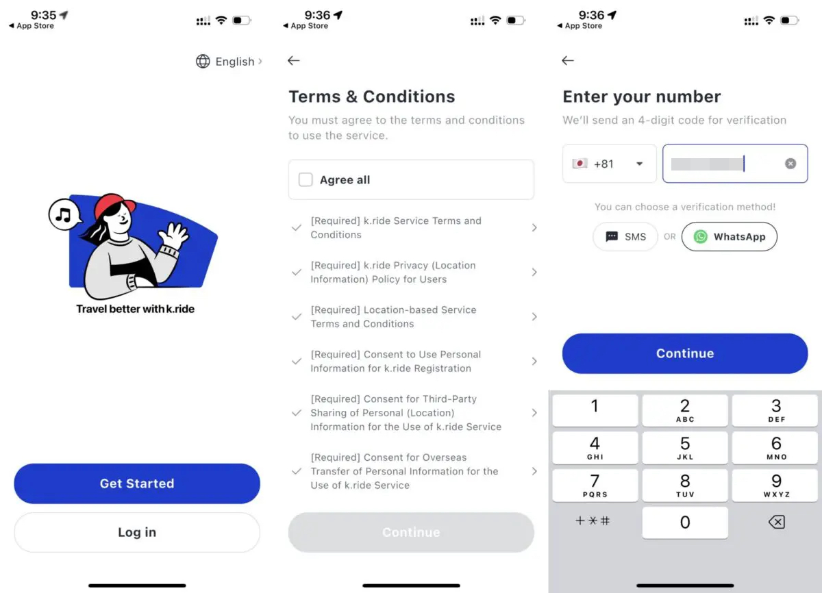 k.rideの登録方法を、画像付きで解説します。画像の言語は英語になっていますが、日本語にも対応しています。