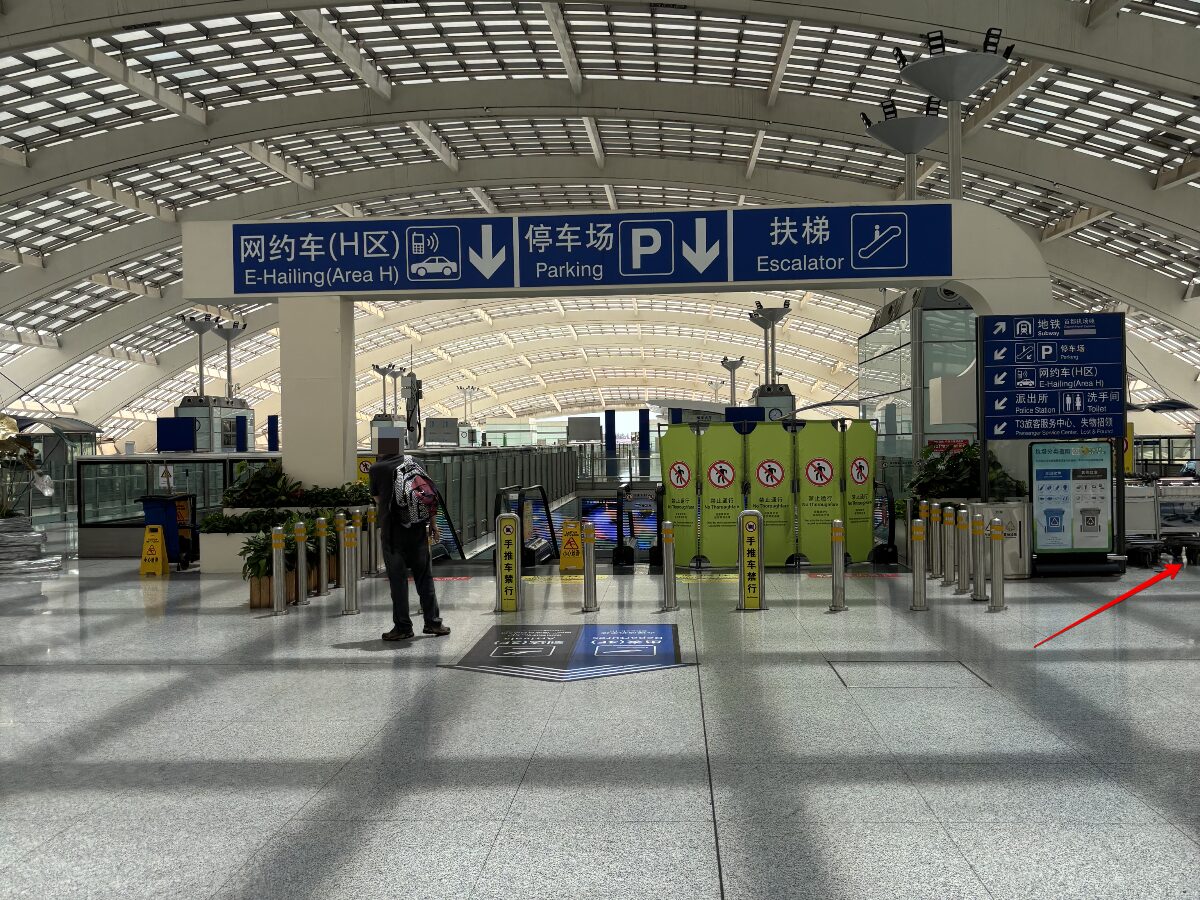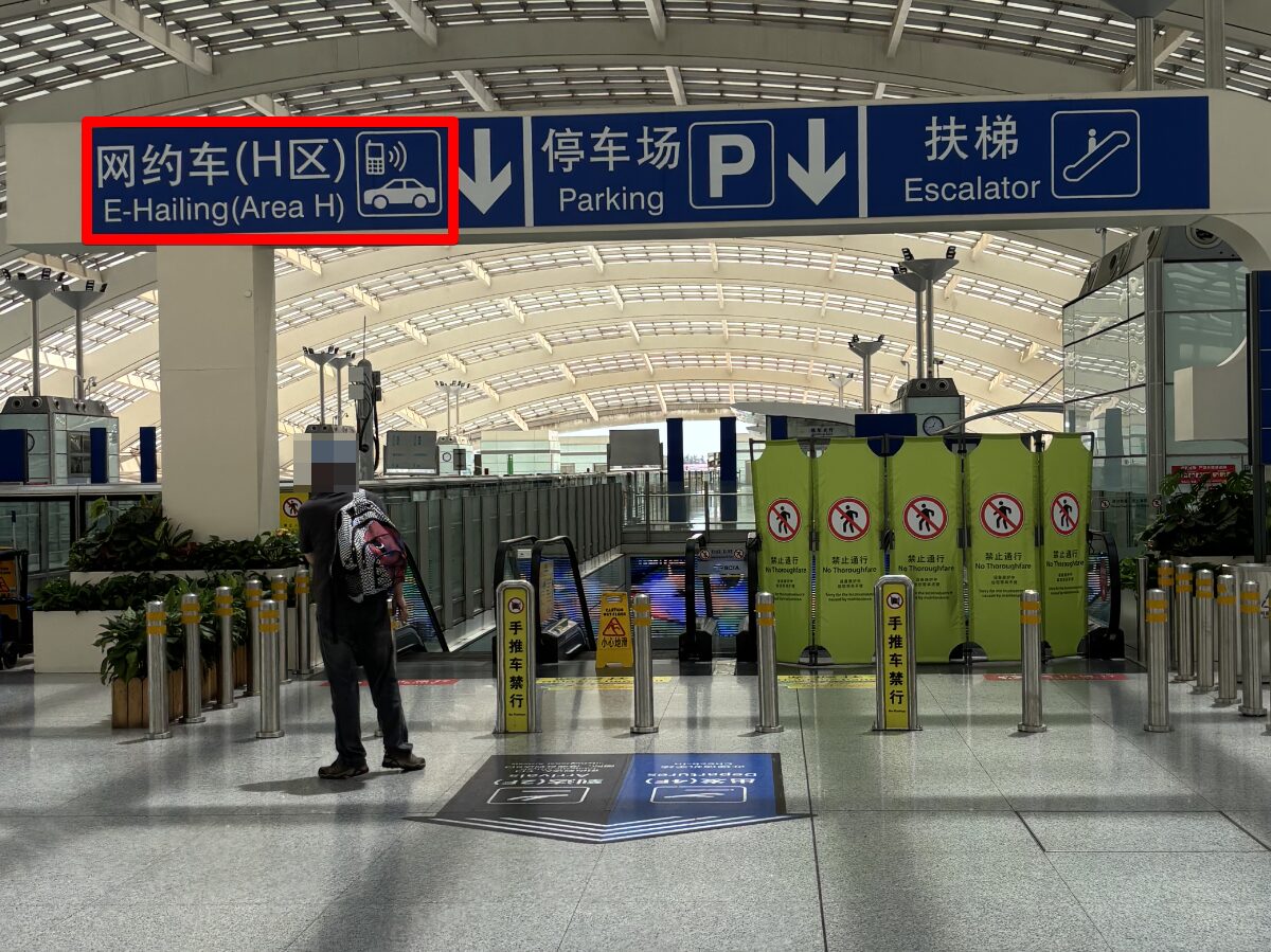 DiDiの乗り場は、駐車場ビルの1階にあります。案内板の「网约车(E-Hailing)」がDiDiの乗り場になります。