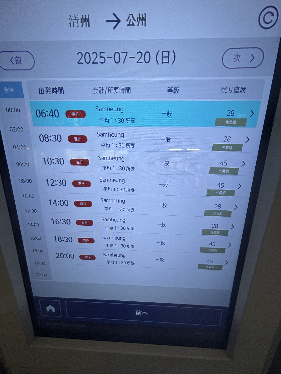 清州 - 公州線は1日8便あります。日帰りの場合は、8:30か10:30の便を利用するのがおすすめです。