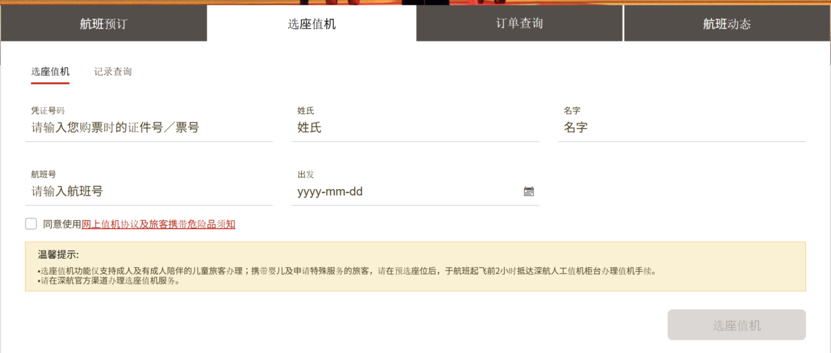 ホームページに入りましたら、「选座值机 (座席指定とチェックイン) 」タブをクリックしてください。そのうえで以下の項目に適切な値を入れてください。