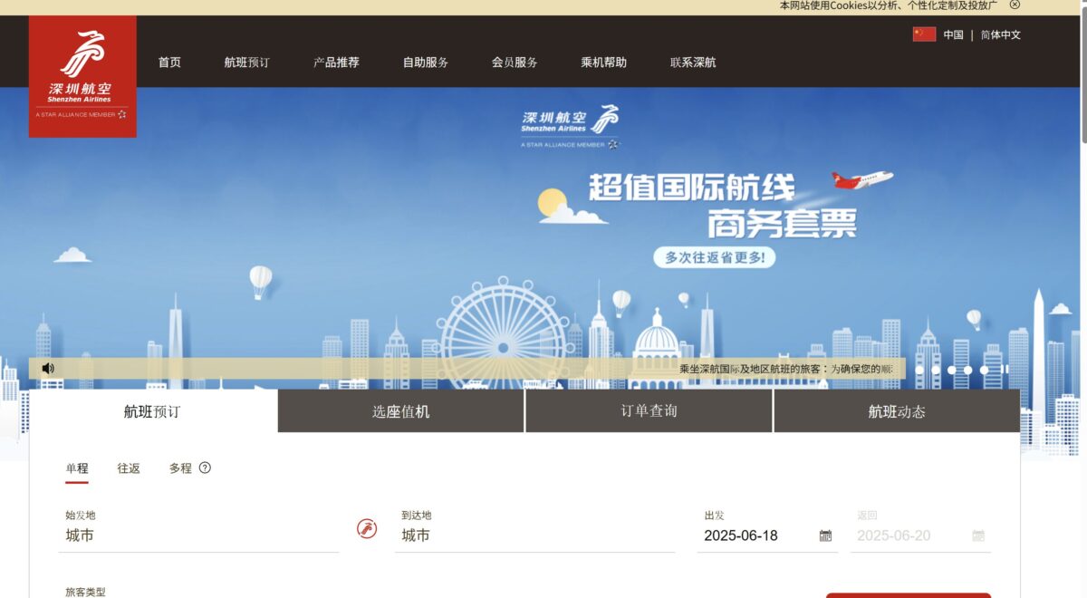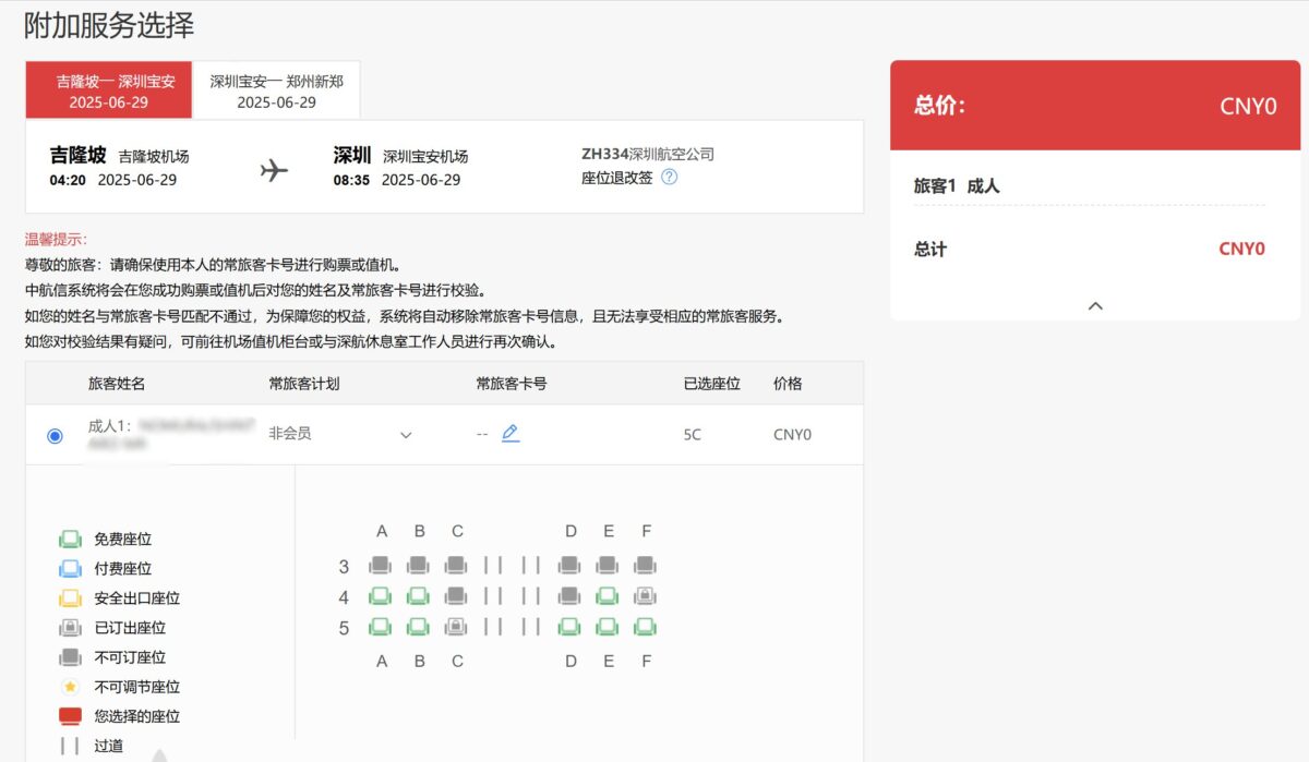 初めは深圳航空の座席指定は不可能と思っていましたが、ロケーションを中国語に変更したところ予約が可能でした。漢字が理解できる日本人にとっては比較的簡単に座席の指定ができるかと思います。
