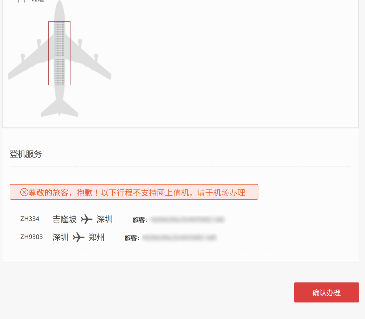 座席指定が完了しましたら、「确认办理 (手続きを完了する) 」ボタンをクリックしてください。