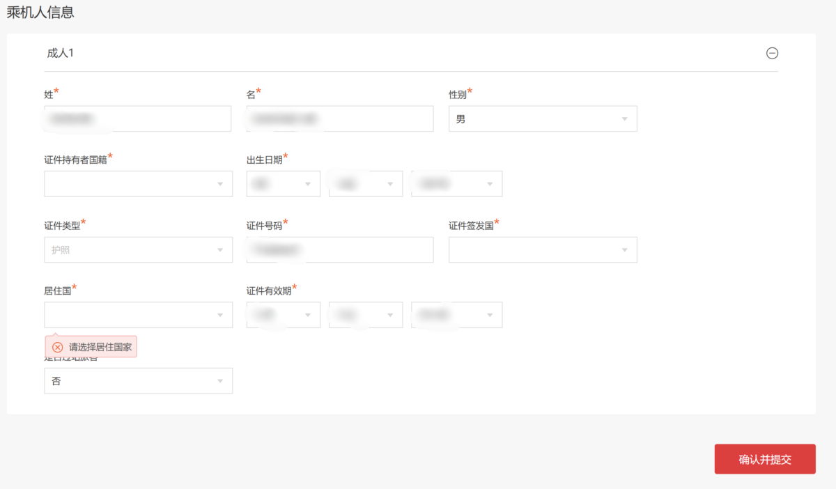 続いて、搭乗者情報を入力する画面が表示されます。いくつかの項目は事前に入力されている一方、国籍情報を中心に入力する項目があります。例えば以下の通りです。