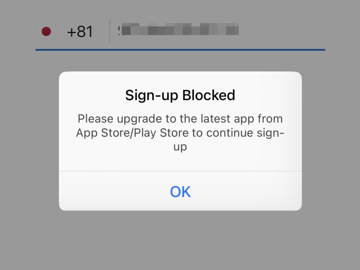 Olaの公式ブログでは、日本の電話番号をサポートしていると書かれていますが、2026年2月現在、最新バージョンのアプリを使い、日本から日本の電話番号で登録しようとすると、「Sign-up Blocked」というメッセージが出て、アプリを最新バージョンにアップグレードするように言われます。