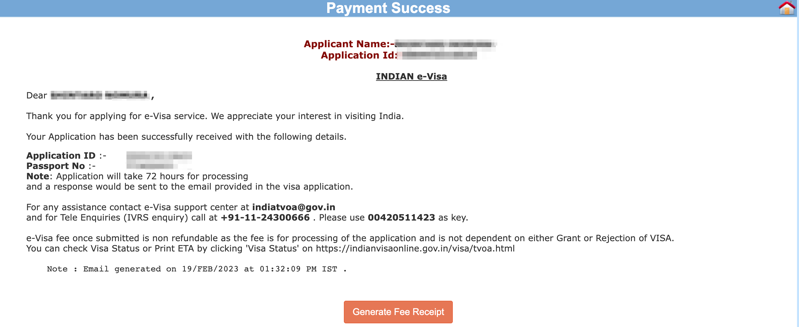 e-Visaの取得は早ければ翌日には完了します。私の場合、翌日のお昼頃に「noreply-vss@nic.in」というメールアドレスより、e-Visaの取得ができたとのメールが届きました。