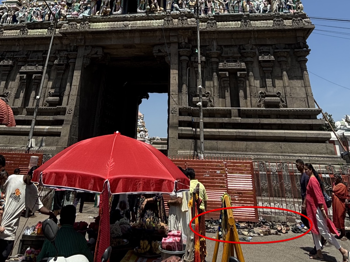 前を歩いていたインド人の方が、上の写真の赤丸の部分に靴を脱いで中に入っていったので、私もそれに従いましたが、ゴープラムの隣に靴を預けるカウンターがあることに帰りに気づきました。