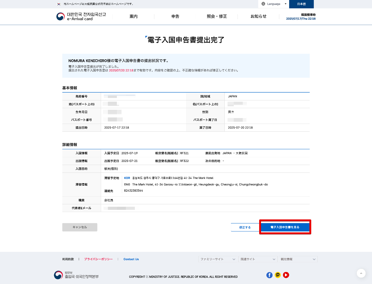 - 「電子入国申請書を見る」をクリックすると申請内容が確認できます。