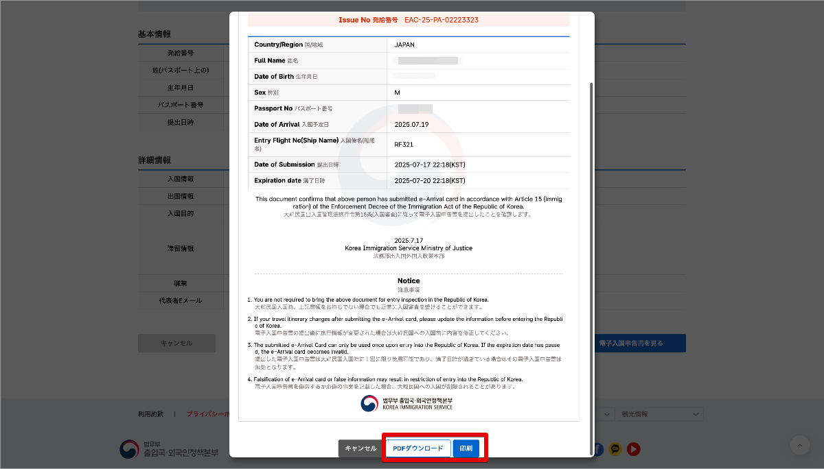 - 申請内容を下までスクロールすると、「PDFでダウンロード」と「印刷」ボタンが表示されますので、念の為PDFをスマホに保存しておくと安心です。