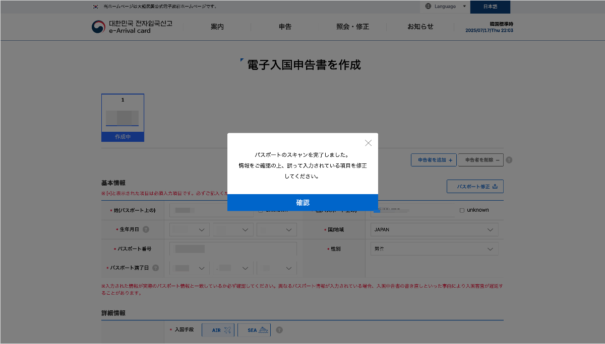 申請は韓国到着予定日を含めた3日前から可能です。早すぎると申請できないので注意してください。