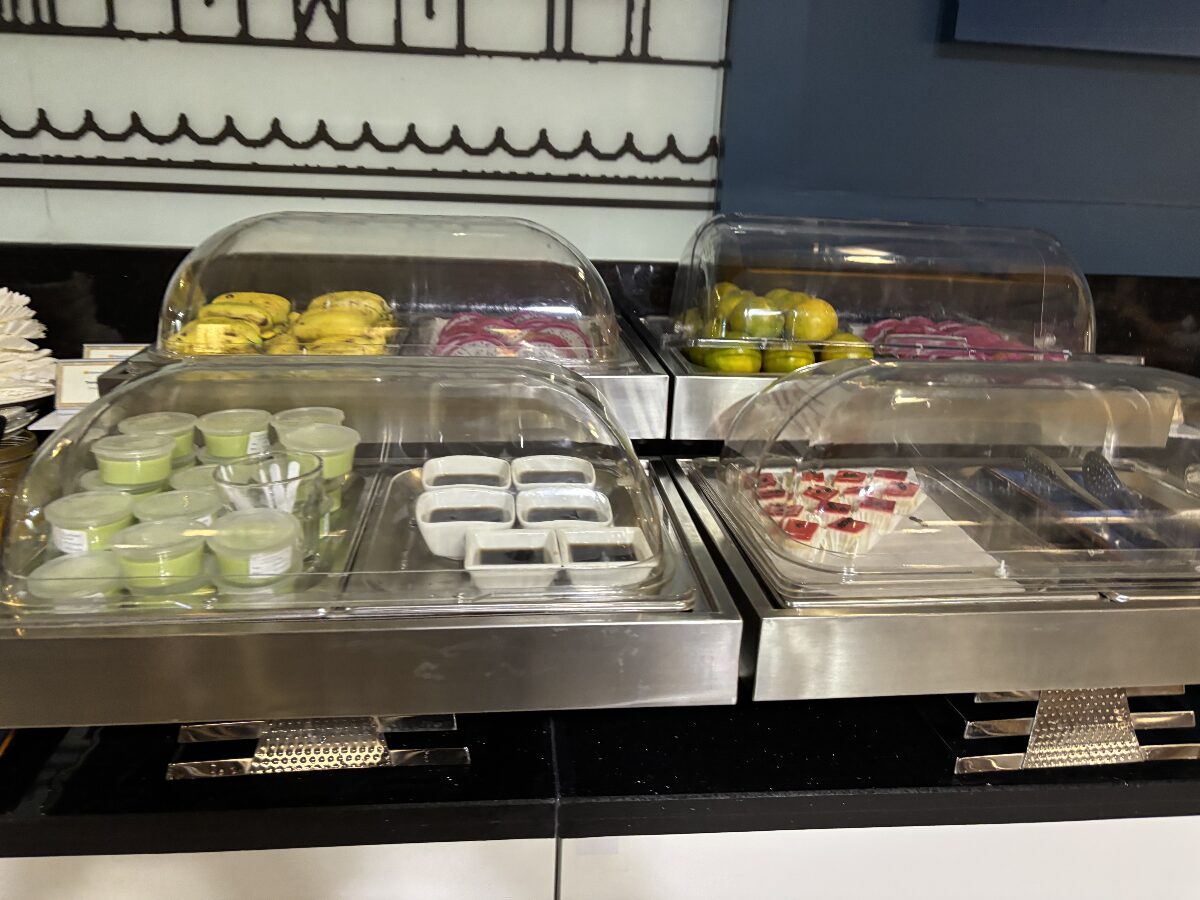 ロータスラウンジの食事とドリンクは、内側の壁沿いに設置された照明付きのカウンターテーブルに、ビュッフェ形式で並べられています。