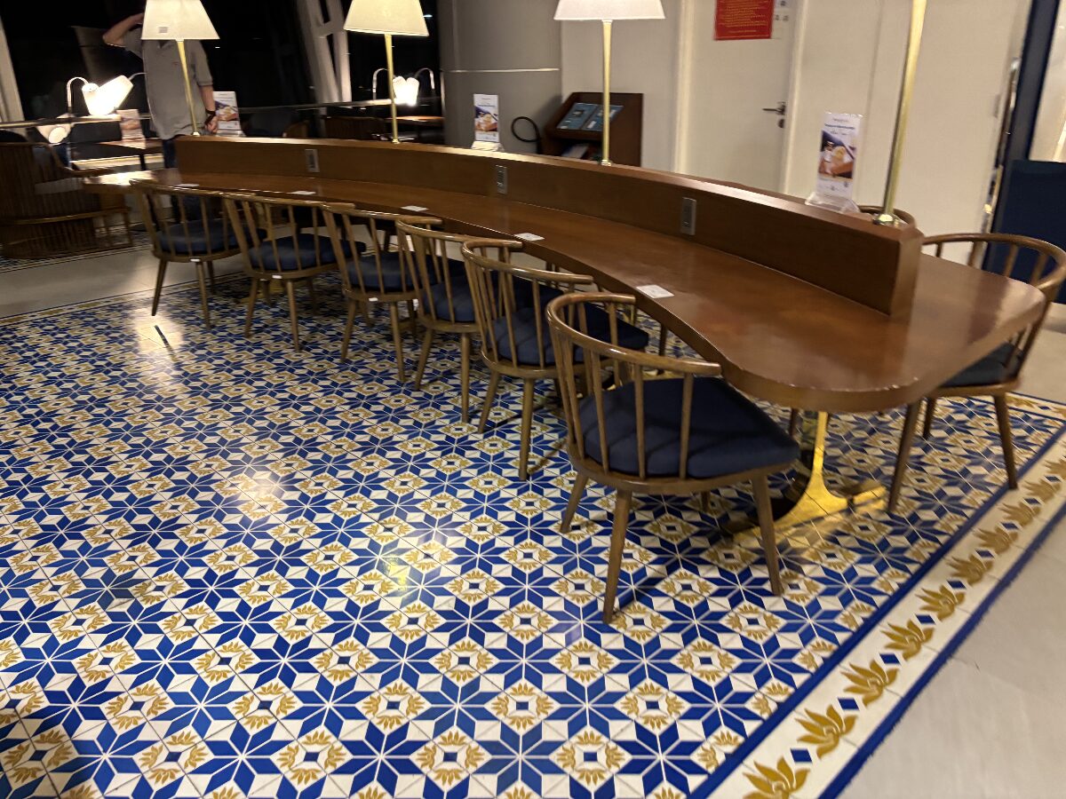 ラウンジの床タイルには、幾何学模様の中に、ベトナム航空のシンボルである蓮が巧みにあしらわれており、とても印象的です。
