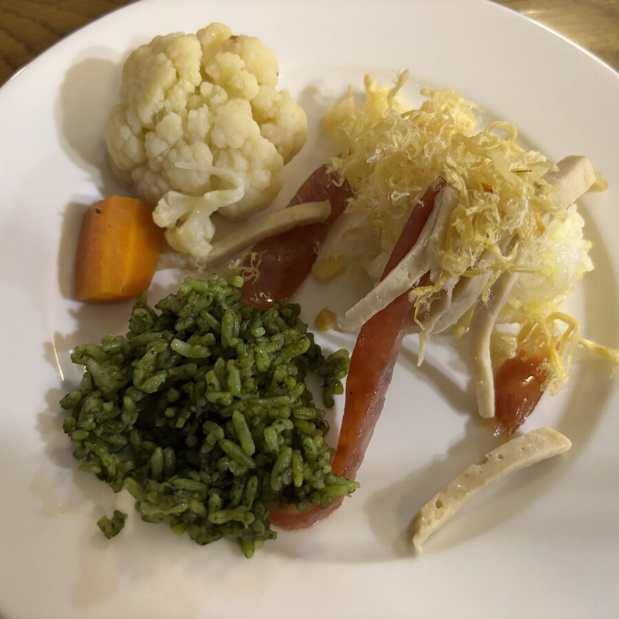 その他のホットミールは、もち米のスチームドライスとソーセージ、フライドチキンやパスタ、炒め野菜などが並び、充実したラインナップです。