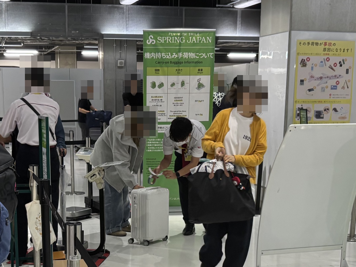 まず、手荷物のチェックがあり、機内持ち込み荷物の計測と、受託手荷物があるかどうかを確認されます。