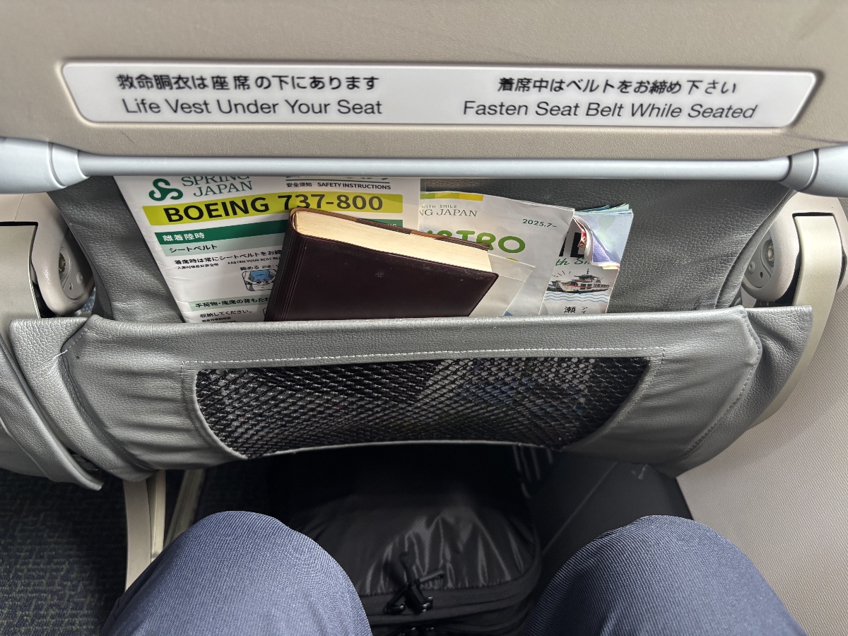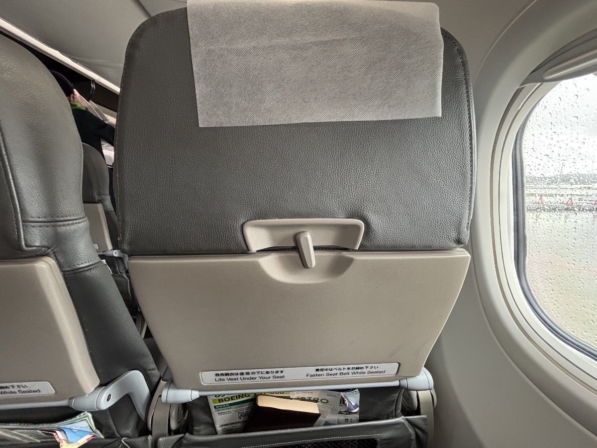 座席のシートピッチは約76cmです。LCCとしては標準的なサイズだと思います。フルサービスキャリアのシートピッチと比べるとやや狭めですが、シート幅も約43cmありますので、3〜4時間のフライトでしたので、ストレスはほとんど感じませんでした。