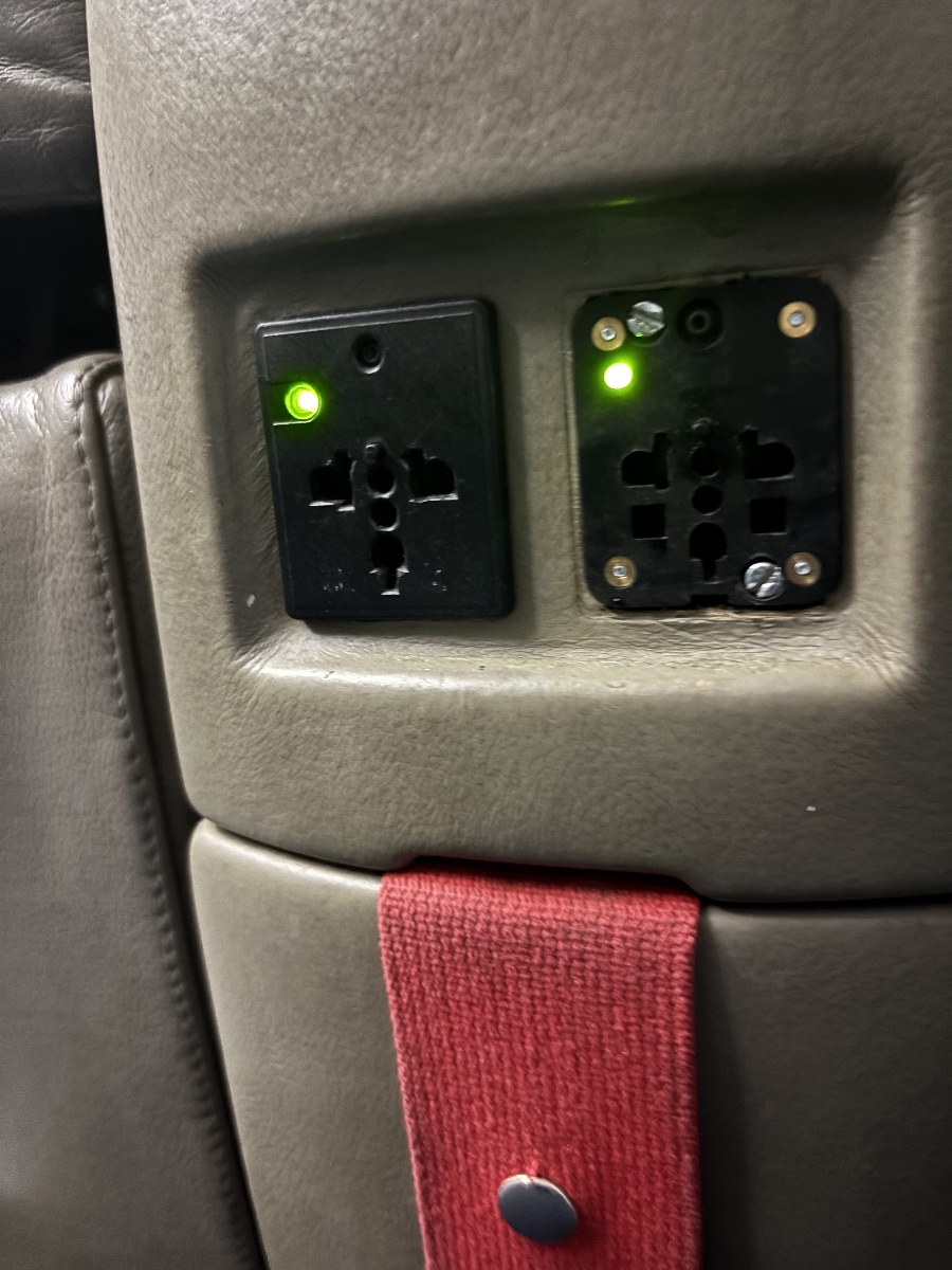 電源は隣のシートとの間にあり、ユニバーサルタイプでしたので、日本のプラグでもそのまま使えます。