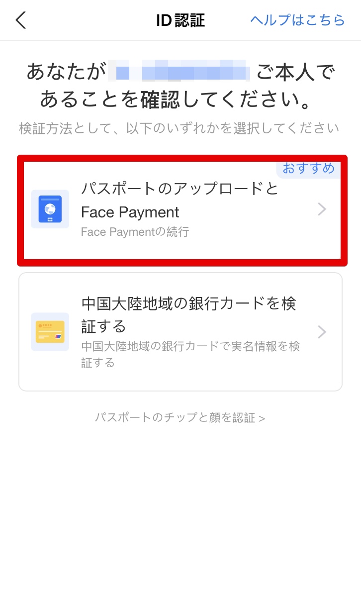 - 私はすでにAlipayにパスポートを登録していますので、アップロード画面は表示されませんでしたが、未登録の方は登録のステップが表示されます。