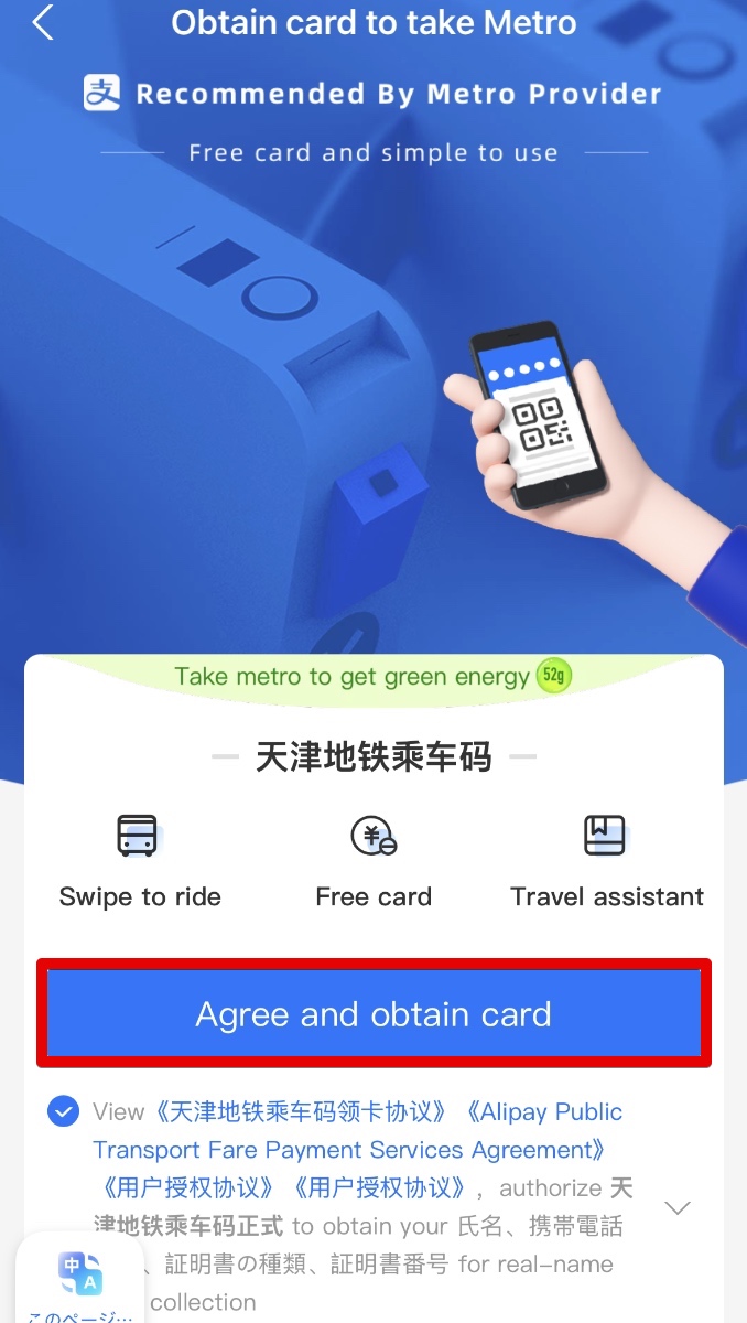 - 次のページで「Agree and obtain Card」をタップします。